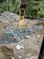 Hydraulic rock hammering can efficiently tackle ledge, reduce the toughest boulder to rubble, be used in demolition, and more, where blasting is prohibited by reason of cost, area size, location, or otherwise. Hydraulic HammerThus, eliminating need for the necessary permits, constraints and blasting equipment required by law, with their associated cost and delay.